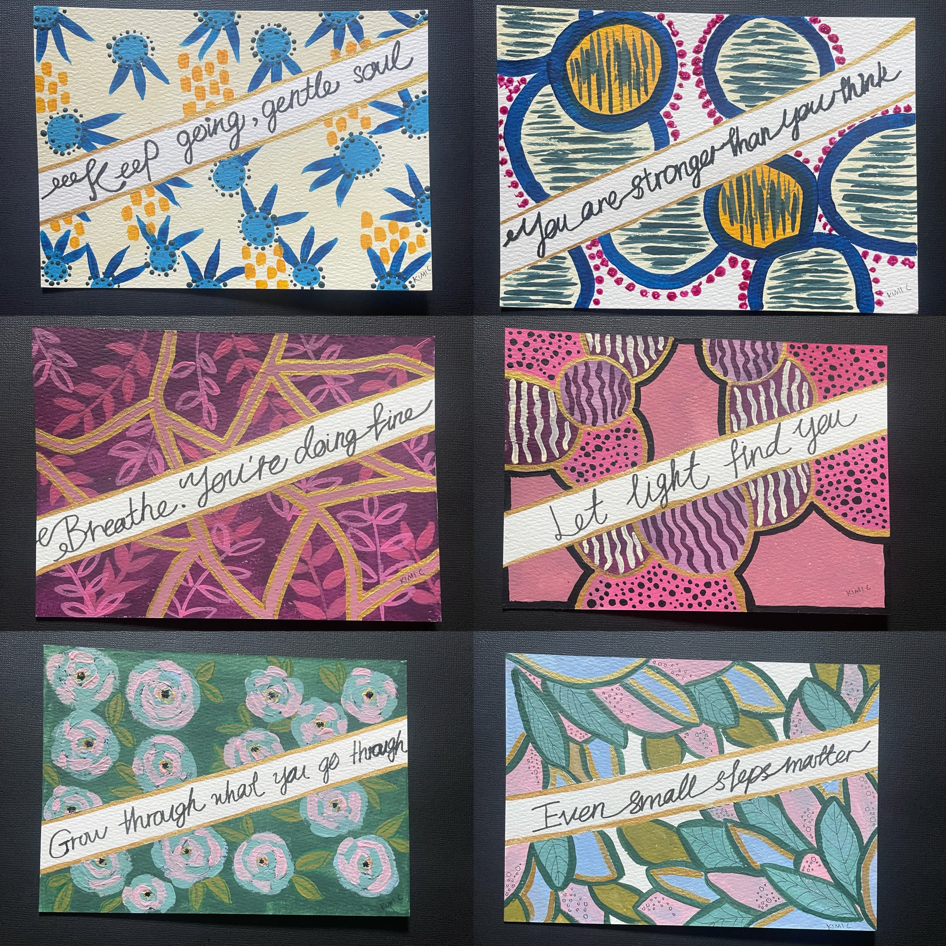This is a set of six original, hand-painted encouragement cards by artist Kimi C.