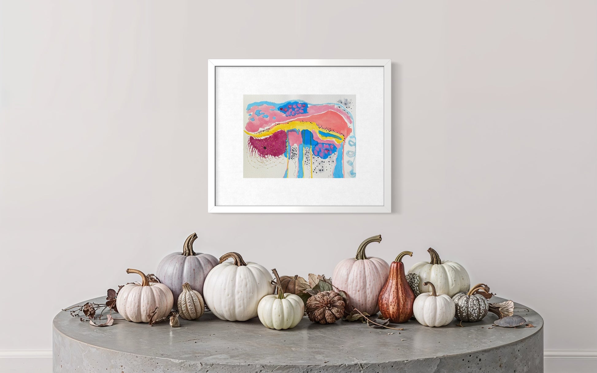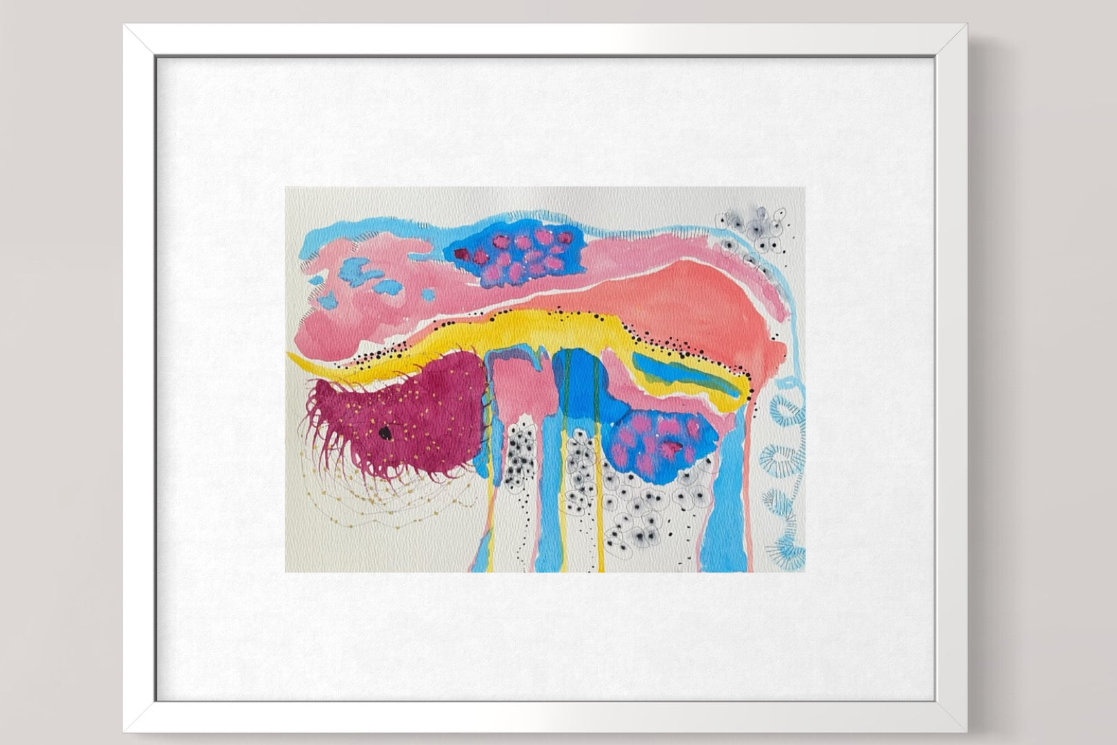 Hand-painted with acrylic inks and delicate linework, this piece blends dreamy pinks, bright blues, sunshine yellow, and soft organic shapes — creating a peaceful yet uplifting visual experience.