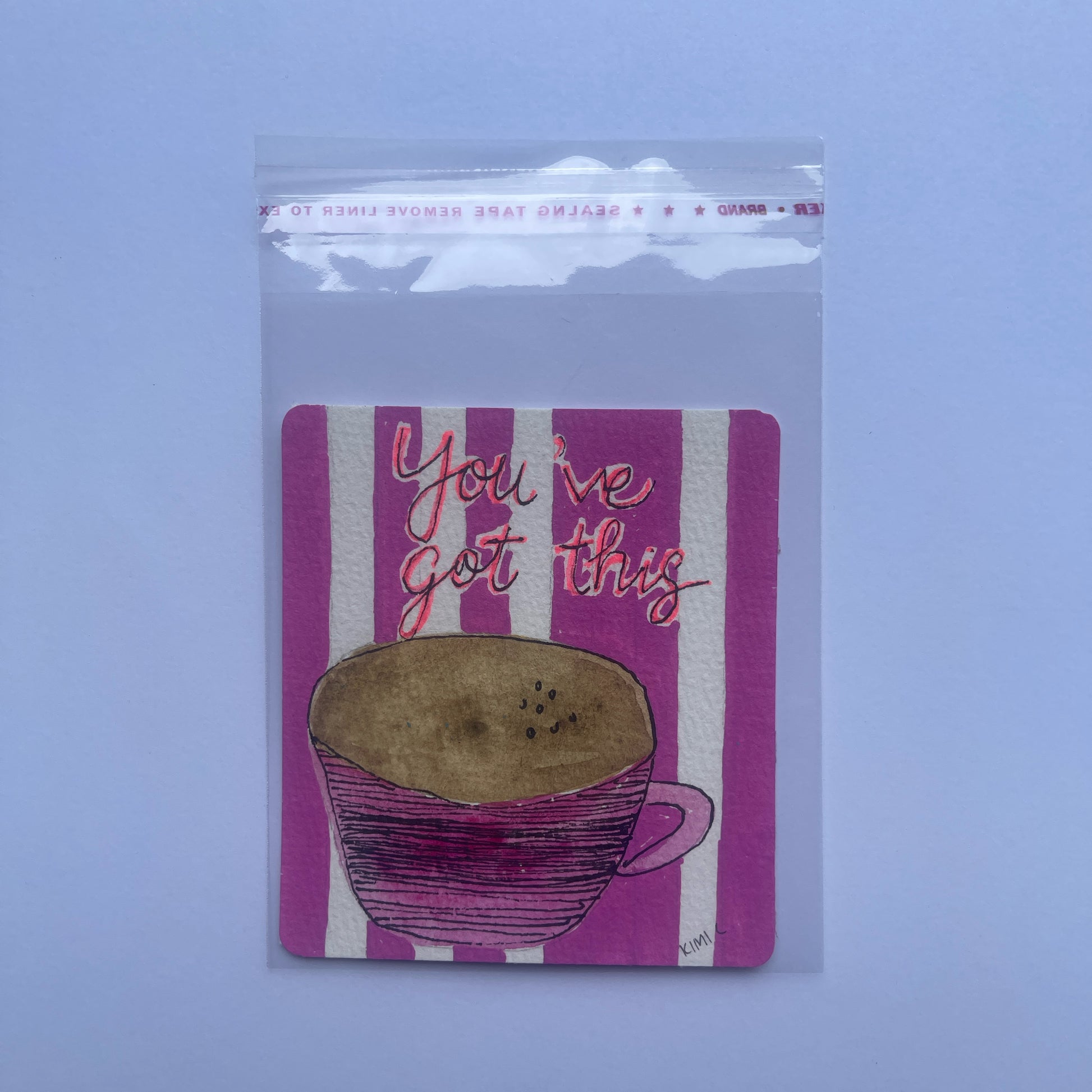This original artwork features a warm cup design with the uplifting message “You’ve Got This”, painted using watercolour, gouache and ink on textured art paper.